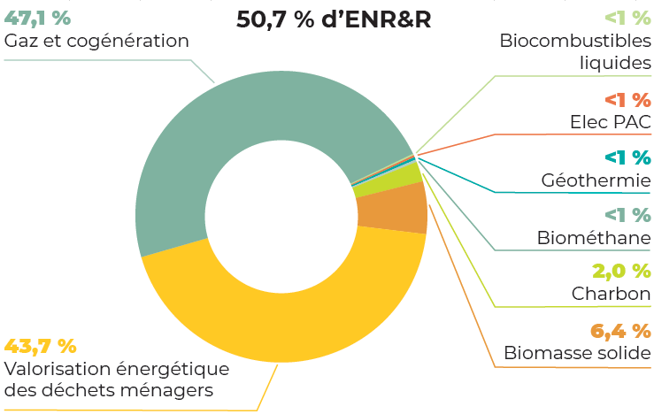 Sur 2024, le mix énergétique de la chaleur livrée par CPCU était le suivant (source site internet CPCU) :